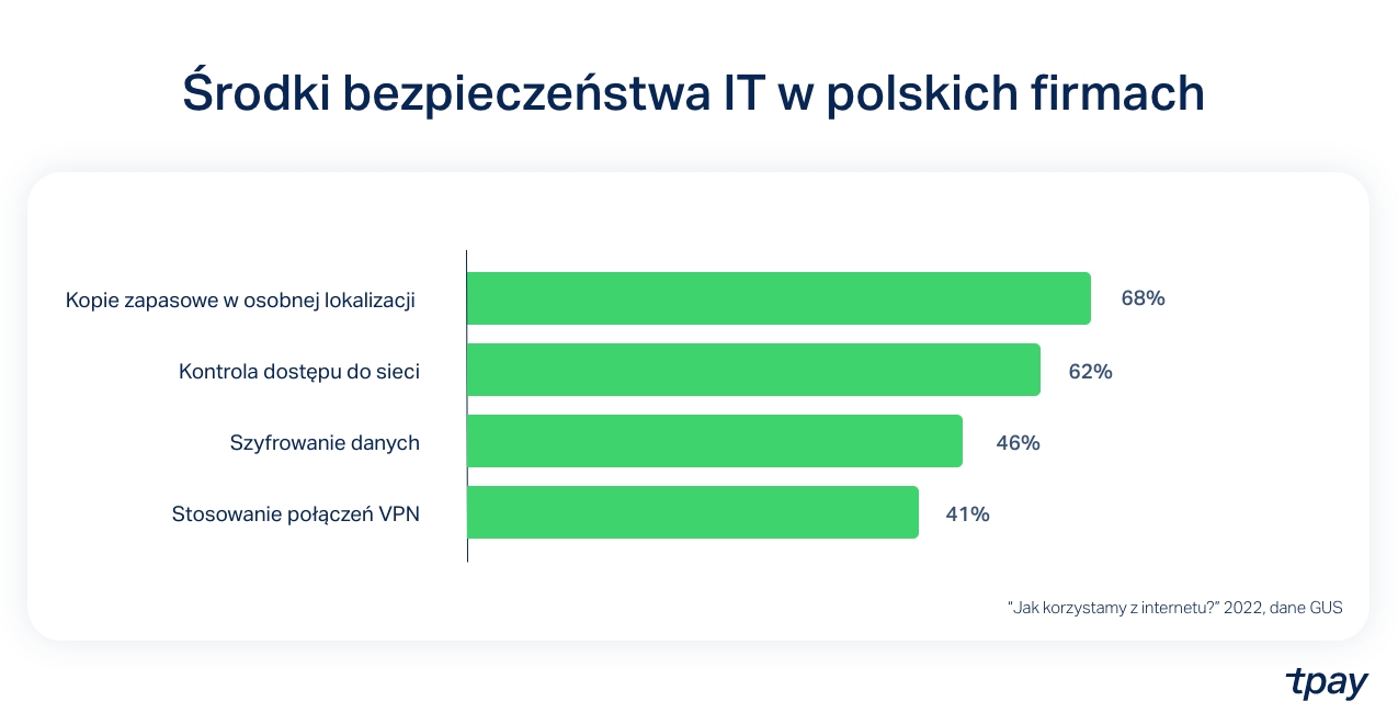 Jak o bezpieczeństwo dbają polskie firmy, w tym e-sklepy? Według danych GUS 68% przedsiębiorstw przechowuje kopie zapasowe danych w osobnej lokalizacji, a 62% - kontroluje dostęp do sieci.