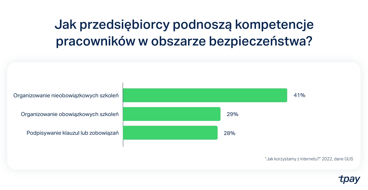 GUS podaje, że tylko niespełna jedna trzecia przedsiębiorstw (z ogółu 51% stosujących jakiekolwiek praktyki w tym obszarze) organizuje cykliczne szkolenia podnoszące świadomość w obszarze cyber zagrożeń dla swoich pracowników.