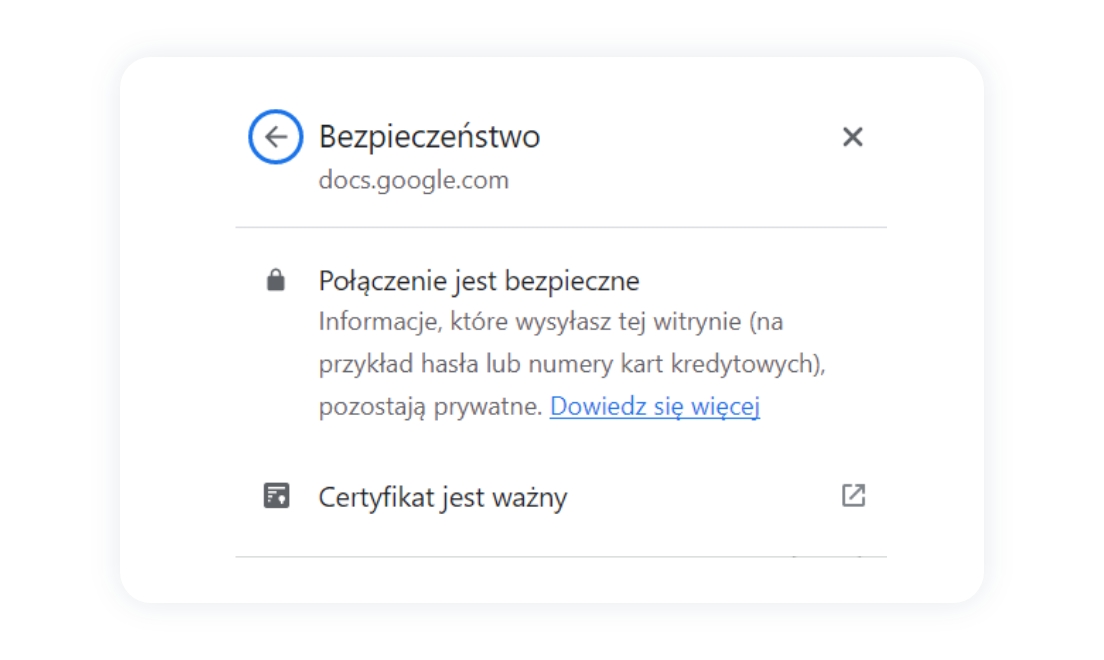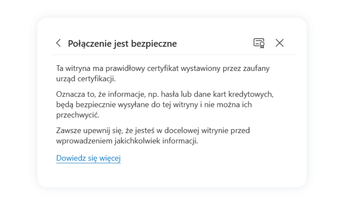 Ważność oraz wykorzystywanie bezpiecznych szyfrów dla certyfikatu SSL można w prosty sposób sprawdzić w przeglądarce internetowej: tuż obok adresu witryny znajduje się mały symbol kłódki, po kliknięciu w który można zobaczyć podstawowe informacje. Poniżej przykłady dla przeglądarek Chrome i Edge.