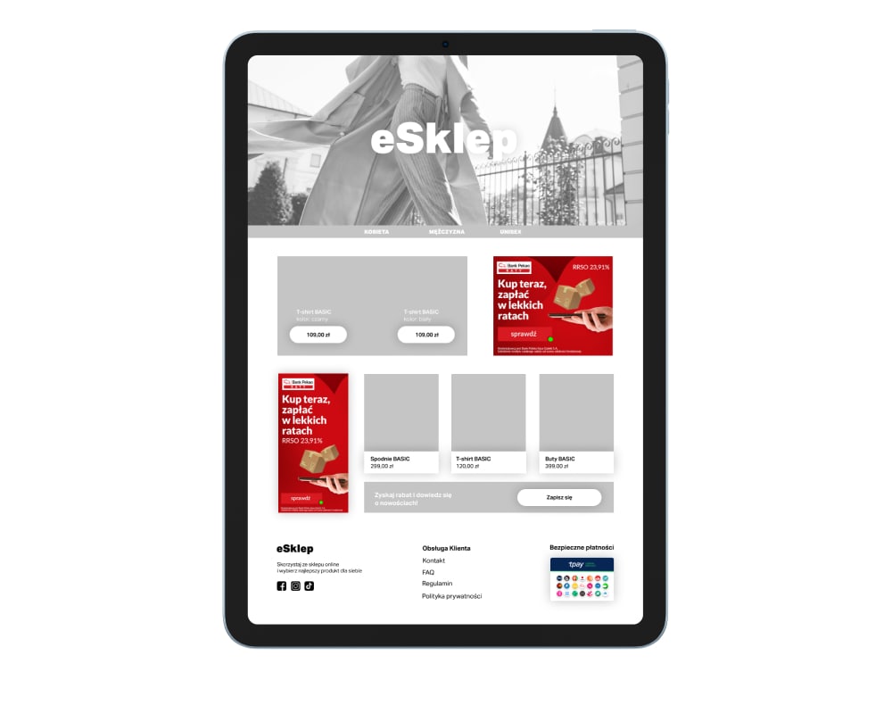 Strona główna sklepu to miejsce, w którym klienci są bardzo często, szczególnie, jeśli dopiero zapoznają się z marką. Umieść na niej baner “Rat Pekao” podlinkowany do szczegółowych informacji. Im więcej informacji przekażesz swojemu klientowi “na starcie”, tym większa szansa, że skorzysta z Twojej oferty.