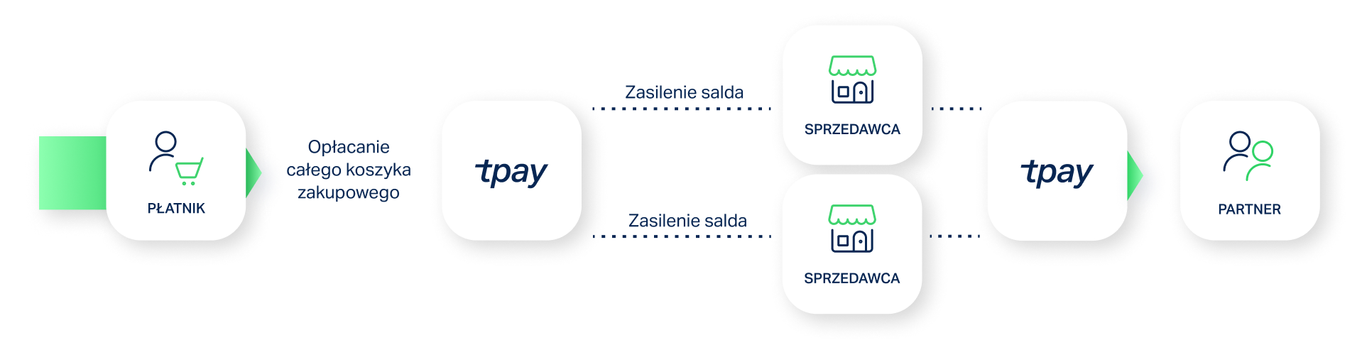 Klient robi zakupy u kilku sprzedawców zrzeszonych w marketplace (w ramach tzw. koszyka zakupowego), następnie płaci za wszystkie zakupy za pomocą bramki płatniczej Tpay, wykonując jedną, zbiorczą transakcję.