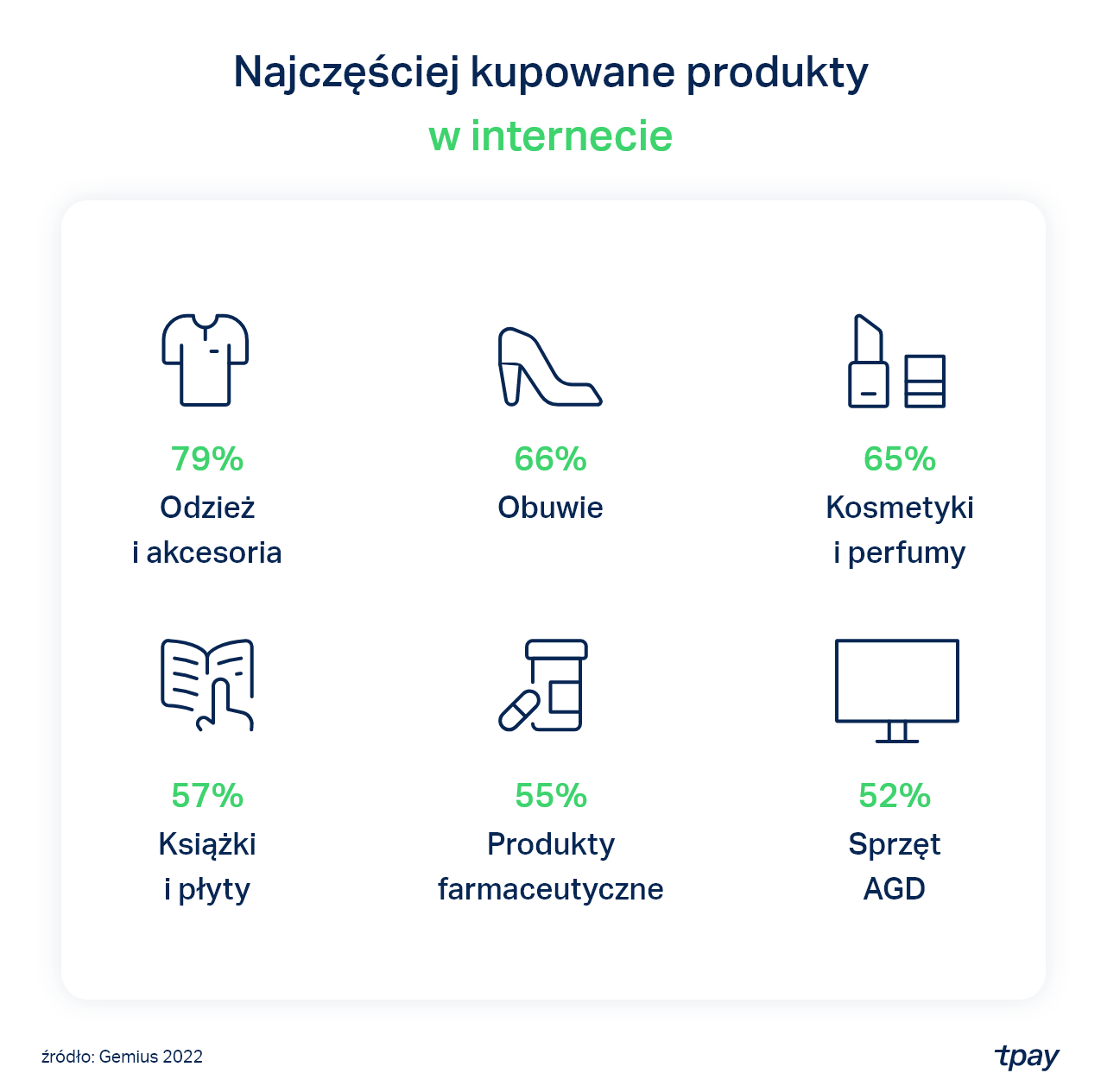 Podobnie jak w poprzedniej fali badania, nadal najczęściej przez internet kupujemy odzież, w tym dodatki i akcesoria z nią związane, a także obuwie, kosmetyki/perfumy, książki, płyty, filmy, oraz produkty farmaceutyczne.