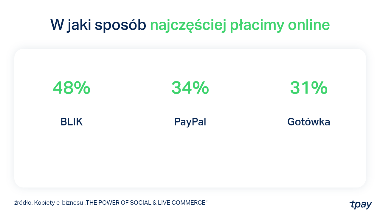 Respondenci “The power of social & live commerce “ zadeklarowali, że jako metodę płatności w mediach społecznościowych najczęściej wybierają BLIK (48% kupujących, podobny wynik uzyskaliśmy w naszych badaniach z SW Research). Na drugim miejscu uplasował się PayPal (34%). Jako trzeci wykorzystywany sposób płatności wskazali gotówkę (31%), której wybór wzrósł aż o 17 punktów procentowych w stosunku do roku 2021.