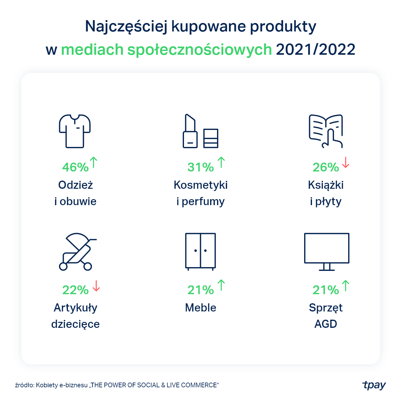 Wiodącymi produktami na rynku, które kupujemy najczęściej w serwisach społecznościowe jest odzież i obuwie (46%). Respondenci decydują się również na zakup kosmetyków i perfumów, książek, płyt, artykułów dziecięcych oraz mebli. Co ciekawe, coraz więcej osób podejmuje decyzję o zakupie sprzętu AGD (21%).